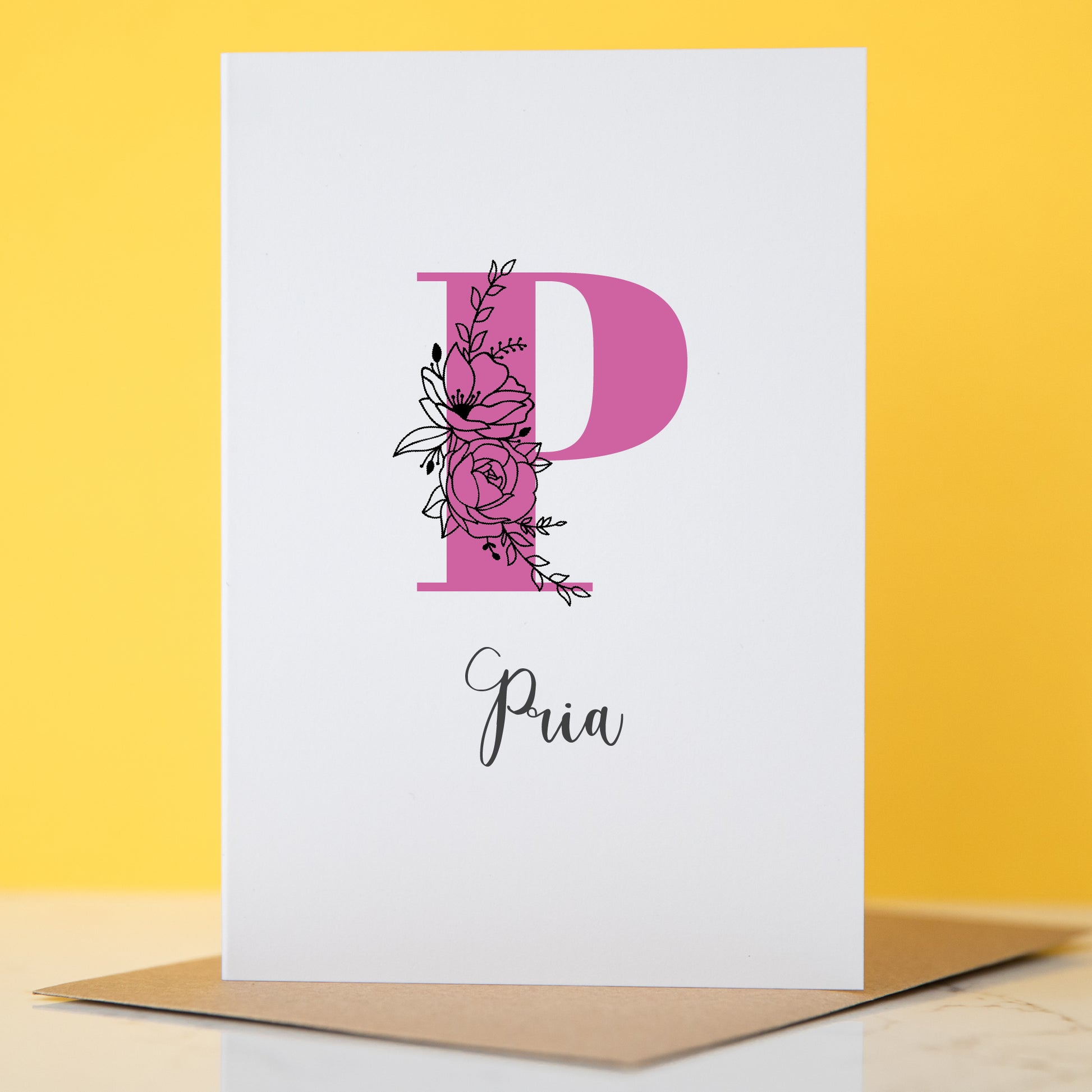 Choose from a selection of colours for the large initial which is adorned in a pretty floral wreath design and finished off with their name underneath.