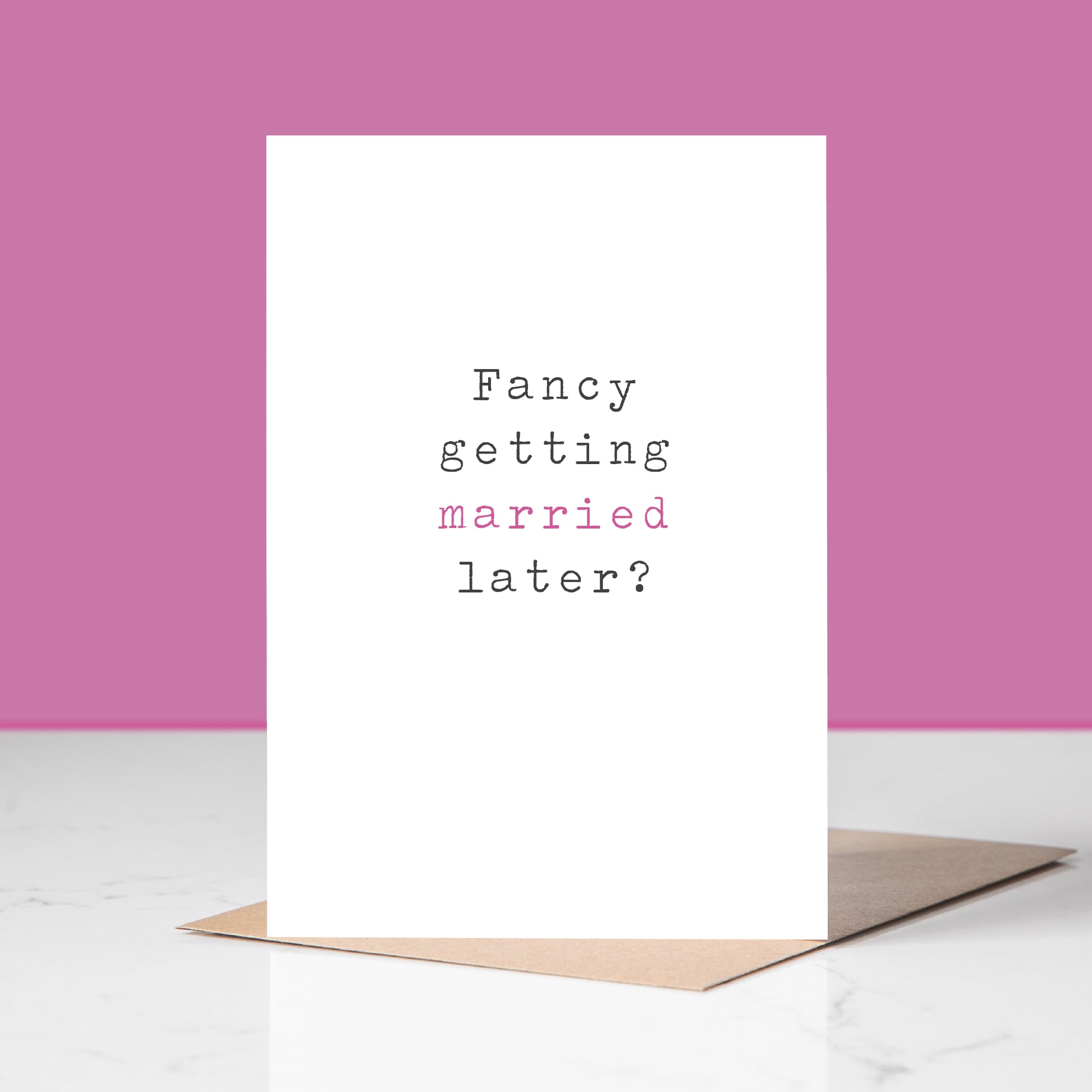 Designed and handmade by Slice of Pie Designs this card reads 'Fancy getting married later?', with the word 'married' picked out in pink for extra emphasis.