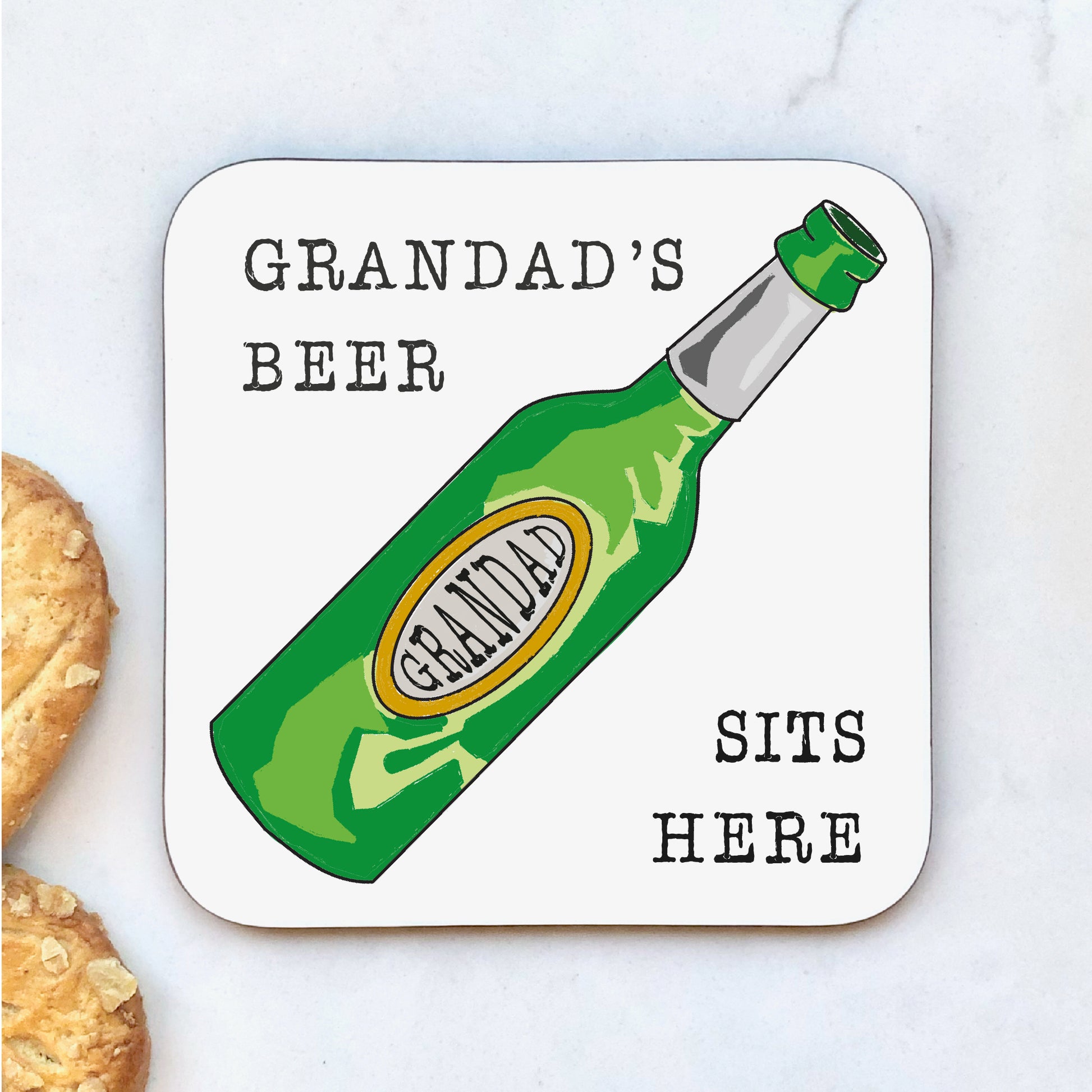 The perfect little gift for a beer loving Grandad. Our glossy drinks coasters feature Laura's beer bottle illustration and the message Grandad's beer sits here, marking his spot for his favourite cold one.