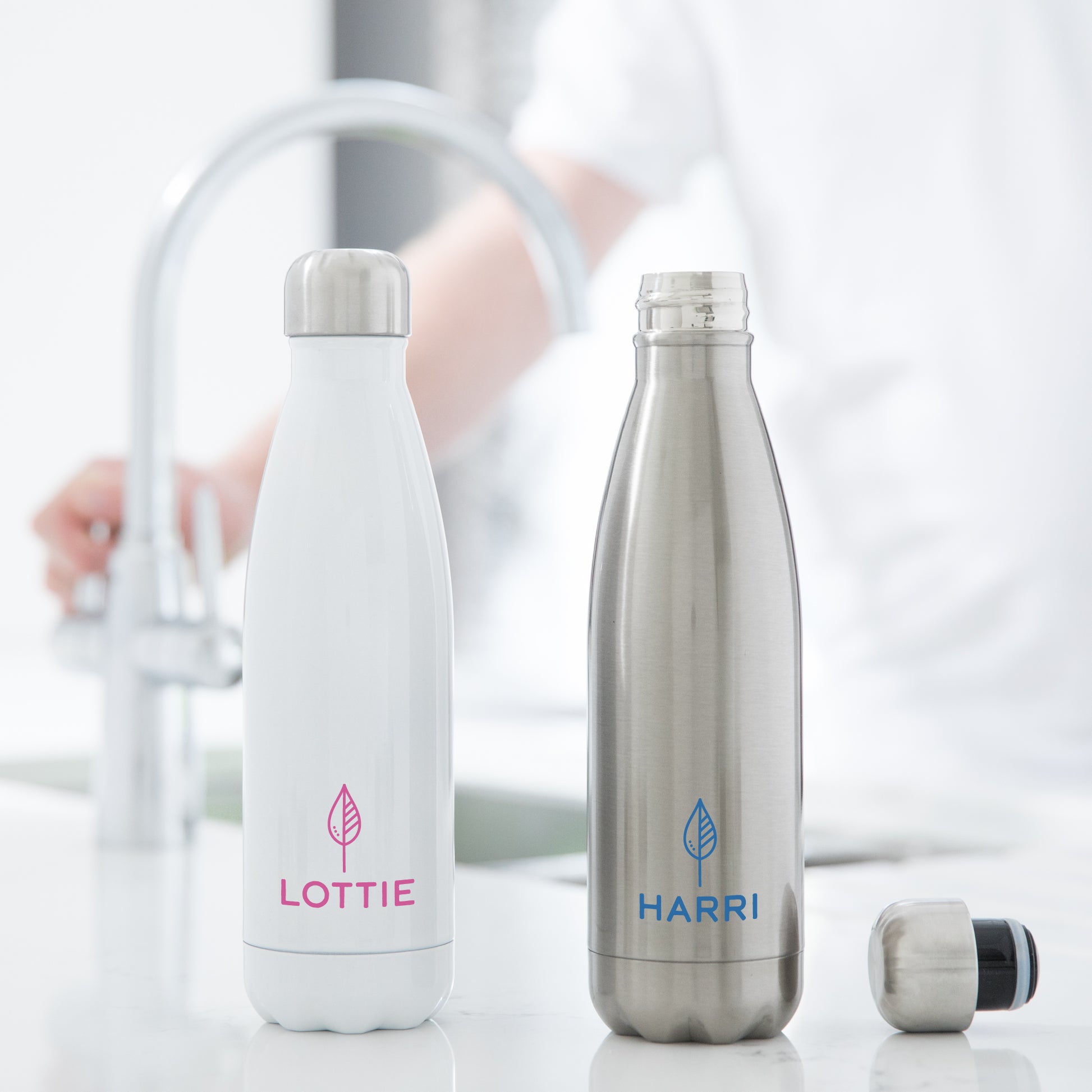 Choose from glossy white or brushed stainless steel, pick a colour for your designs and add a name to personalise your bottle.