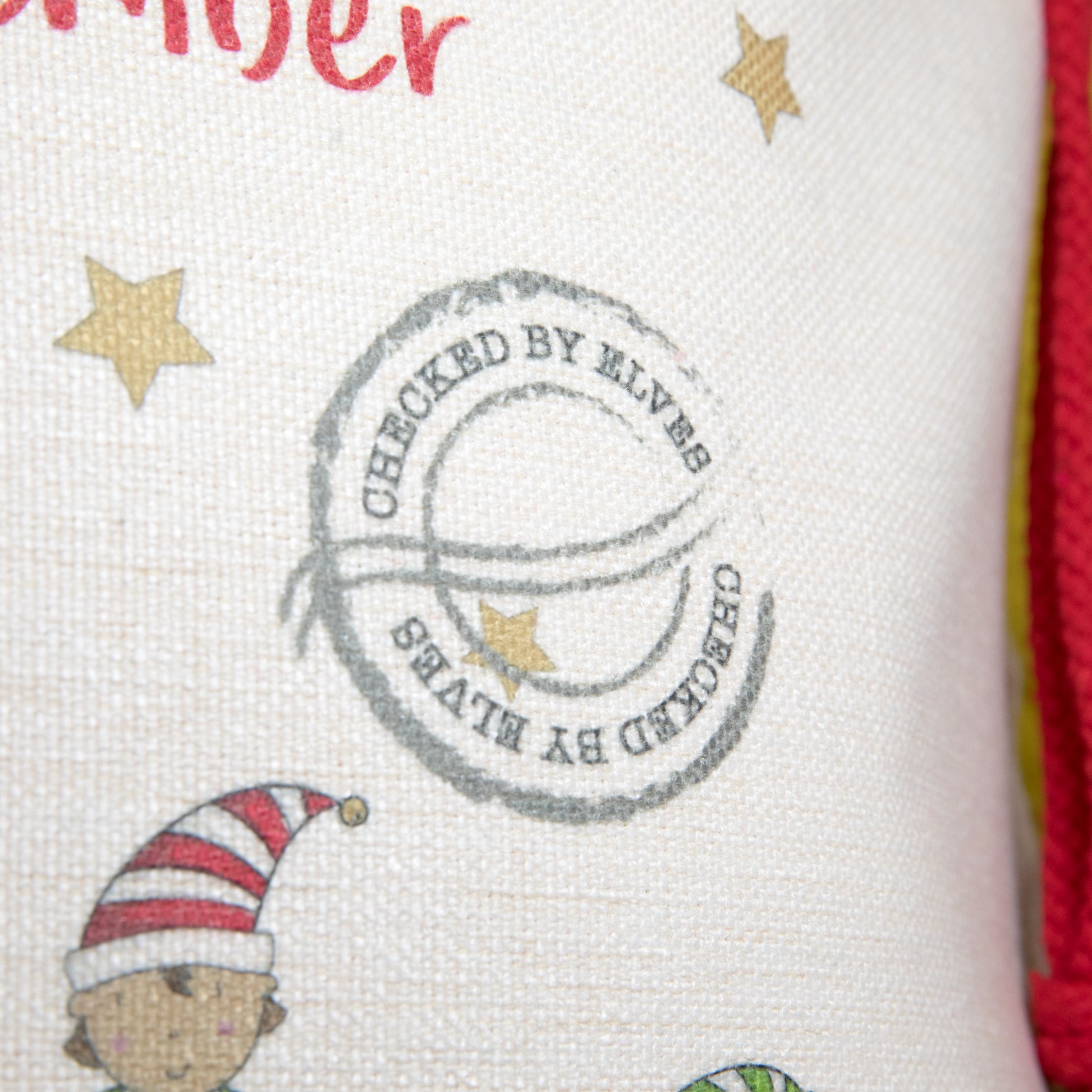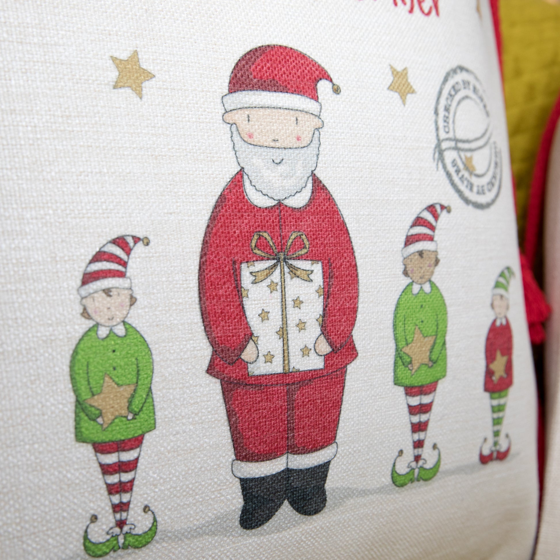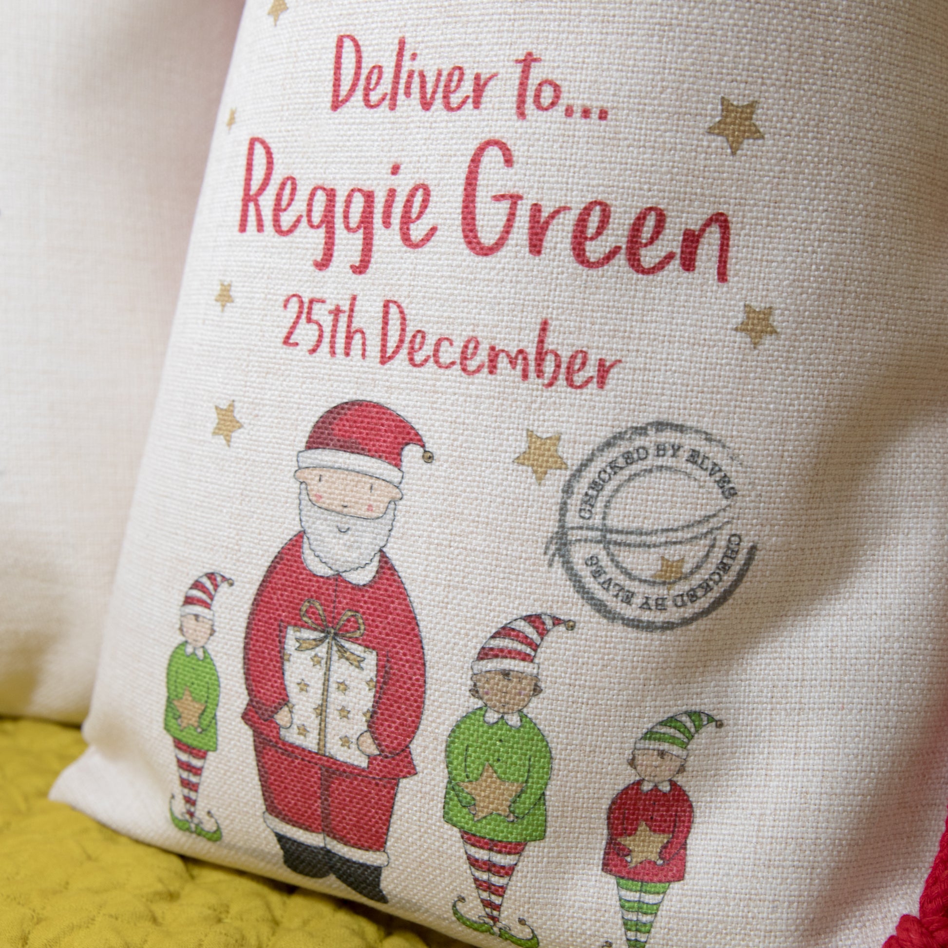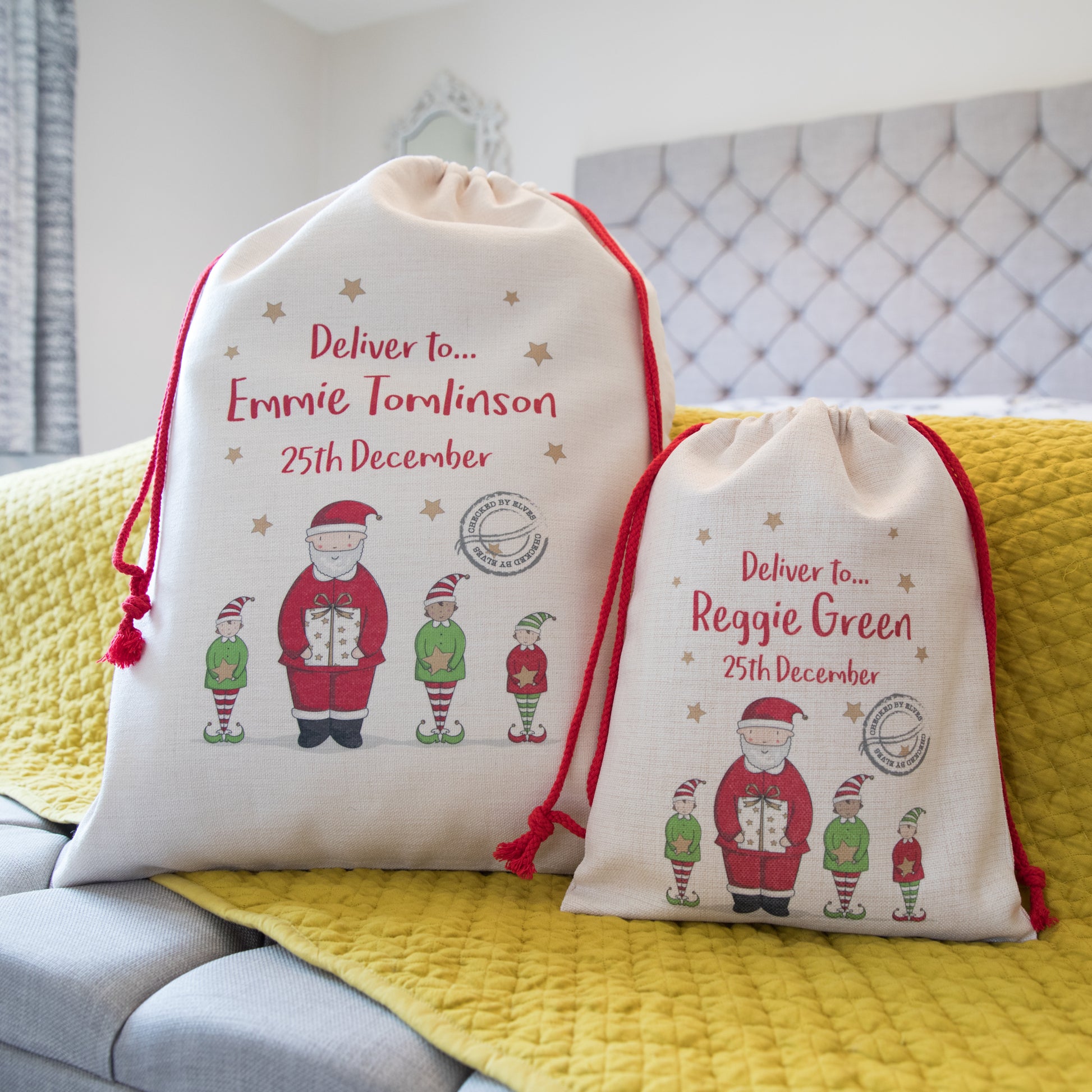 Our personalised Christmas sacks feature Father Christmas and his helpers printed on a heavy weight linen feel fabric with red cotton cord ties.